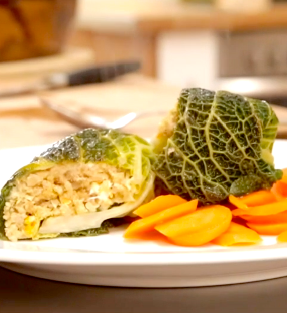 Grünkernschrot in die kochende Gemüsebrühe geben, aufkochen, ca. eine halbe Stunde quellen und dann etwas abkühlen lassen. Wirsingblätter blanchieren und in kaltem Wasser abschrecken. Die Zwiebeln in der heißen Butter gut anbraten und dann Sellerie und Karotten mit andünsten. Gemüse, Eier, Semmelbrösel, Kräuter und Schafskäse zum Grünkern geben und gut verrühren. Mit Pfeffer und Muskatnuss abschmecken. Wirsingblätter mit der Grünkernmasse füllen, aufrollen und dann in eine gefettete Auflaufform schichten. Im vorgeheizten Backofen bei ca. 160 Grad Umluft ca. 45 Minuten backen. Eventuell etwas Wasser zugießen und die Rouladen mit Butter bestreichen.